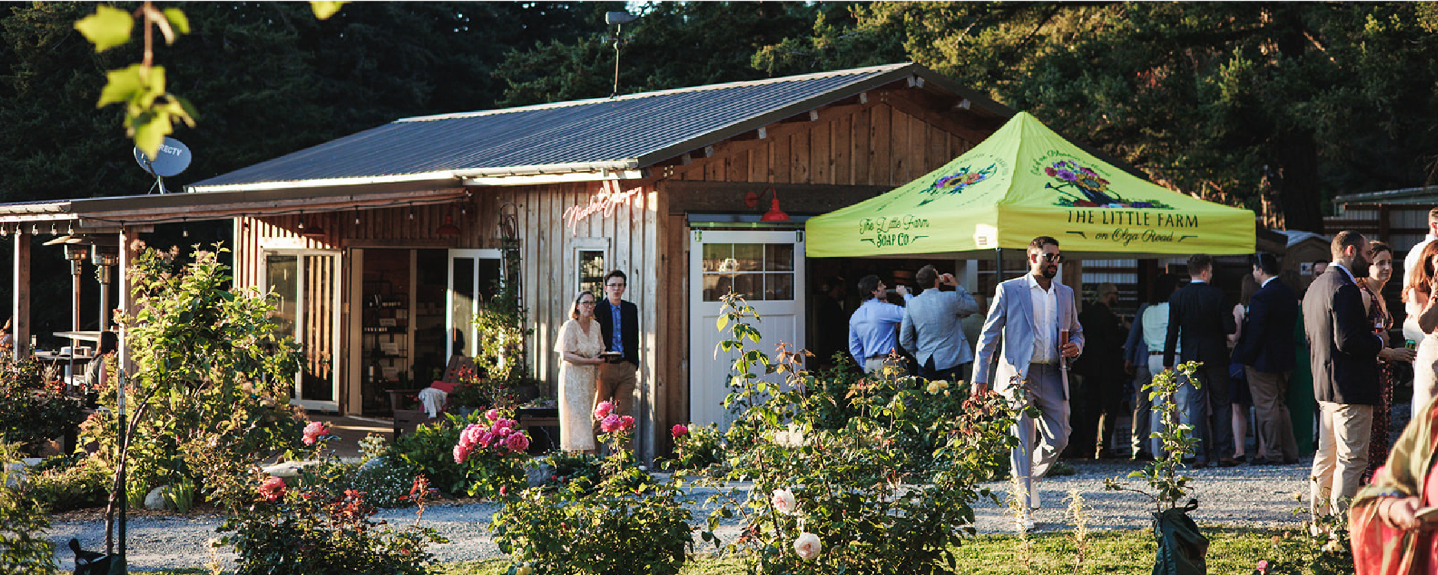 Welcome your wedding guests or celebrate a milestone anniversary surrounded by blooms, open skies, and sweeping views over Judd Cove Preserve and Bay. Perched on a gentle knoll along Olga Road, The Little Farm offers one of Orcas Island’s most intimate and sought-after gathering spaces. From elegant garden welcome parties to candlelit celebrations under the stars, our flower-filled grounds and charming barn create a setting that feels both elevated and effortlessly romantic.